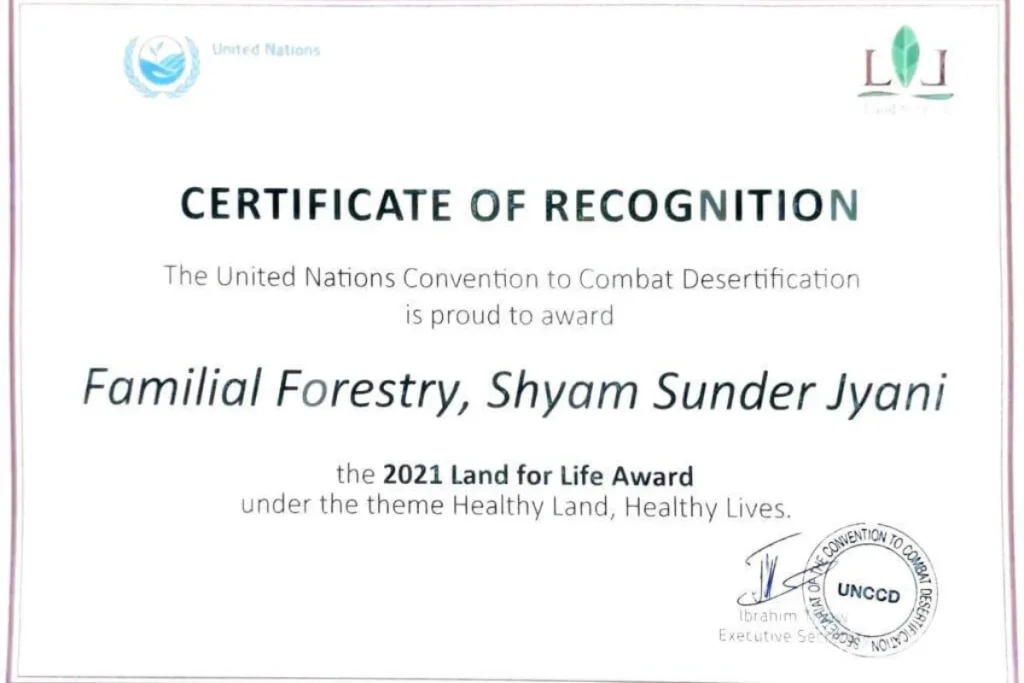 "Congratulations to Sh. Shyam Sunder Jyani, Associate Professor at Dungar College Bikaner, selected for prestigious Land for Life Award 2021 by UNCCD. It's for his unique concept of Familial Forestry of Rajasthan that relates a tree with a family, making it a green family member."